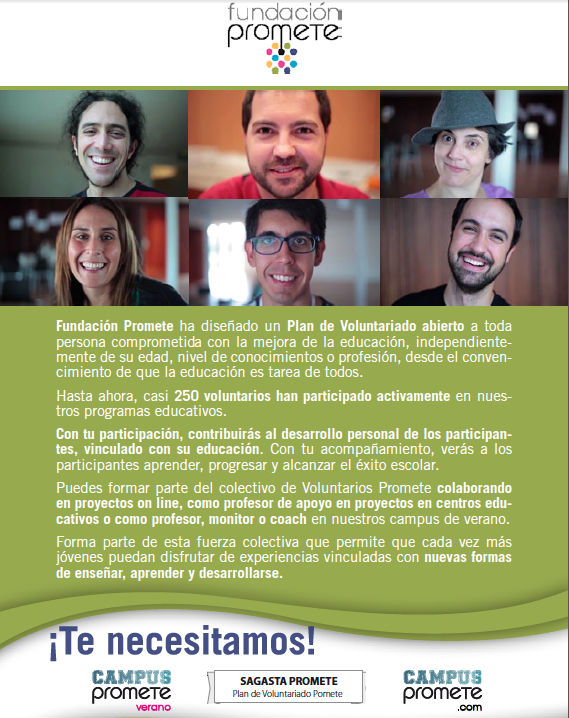 Actualmente Fundación Promete está implementando su campaña de captación de voluntarios de distintos perfiles, sin límites de edad, para sus programas educativos Sagasta Promete y Campus Promete 2014, desde el convencimiento de que la educación es tarea de todos.